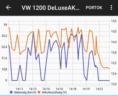 A grafikon fölötti Portok gombra koppintva megnyíló listában jelennek meg az eszköz által küldött, grafikonon megjeleníthető port értékek nevei. A megjelenítendő adatra bökve a sebességtől eltérő színnel kirajzolódik a görbe a grafikonra. A sebesség értékek a grafikon bal oldalán olvashatók le, a választott port értékei a jobb oldalon jelennek meg.