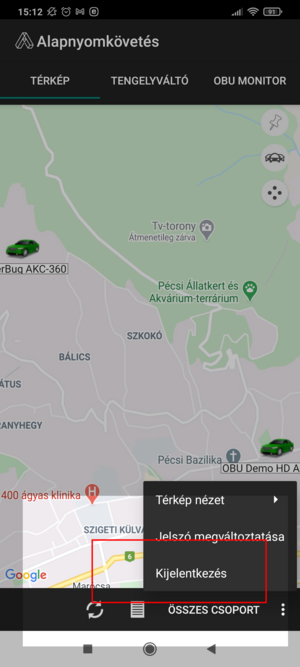 A menü legfelső opciója a Térkép nézet választó. A webes felülettel megegyező módon a Google térkép használata a mobil alkalmazásban is jogosultság függő. Google jogosultság nélkül, alapértelmezetten az OSM térkép használatát biztosítjuk ügyfeleinknek, a jogosultság birtokában viszont három megjelenítés áll rendelkezésre: Térkép (alapértelmezett), Műhold és Hibrid.