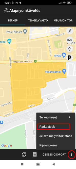 Az alkalmazás láblécének jobb szélén elhelyezett, három ponttal jelölt menüt kinyitva található meg a Parkolás lista.
