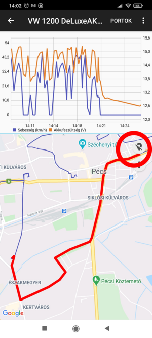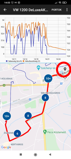 Ez a megjelenítés részletes információkkal szolgál a vizsgált intervallumban megtett Útvonalról. A kijelző felső hányadában grafikonon rajzolódik ki a sebességgörbe, alatta a térképen az útvonal látható.