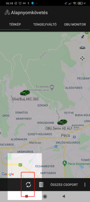 Az alkalmazás rendszeresen, 30 másodpercenként frissíti az adatokat, de a Frissítés gombra koppintva a megjelenített eszközök pozíciója és adatai azonnal aktualizálódnak.