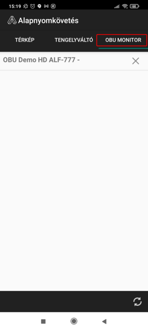 - az alsó és felső menüsor közti területen a felső menüsorban kiválasztott funkciónak megfelelő tartalom jelenik meg, tehát vagy a térkép, a tengelyváltó, vagy az OBU monitor jelenik meg.