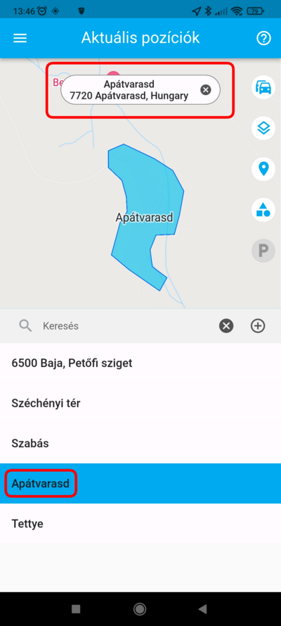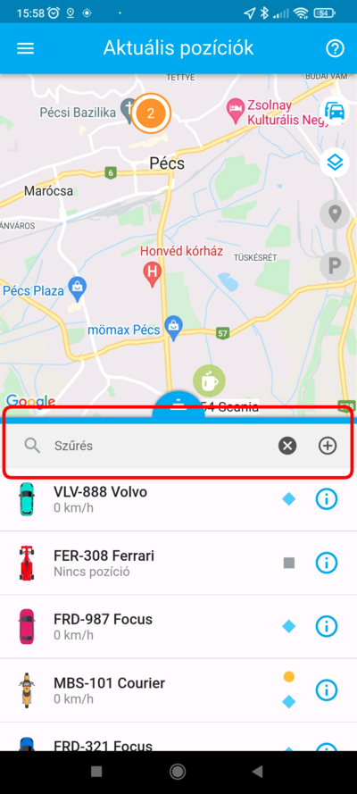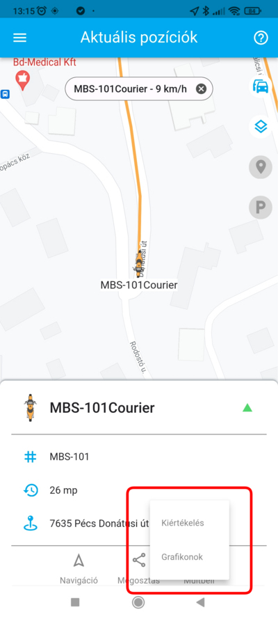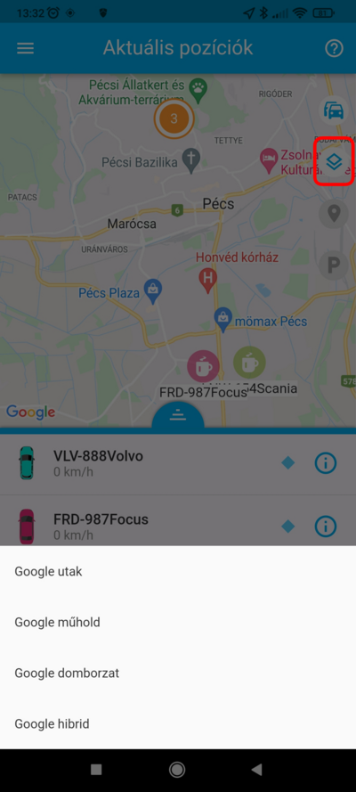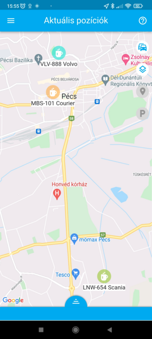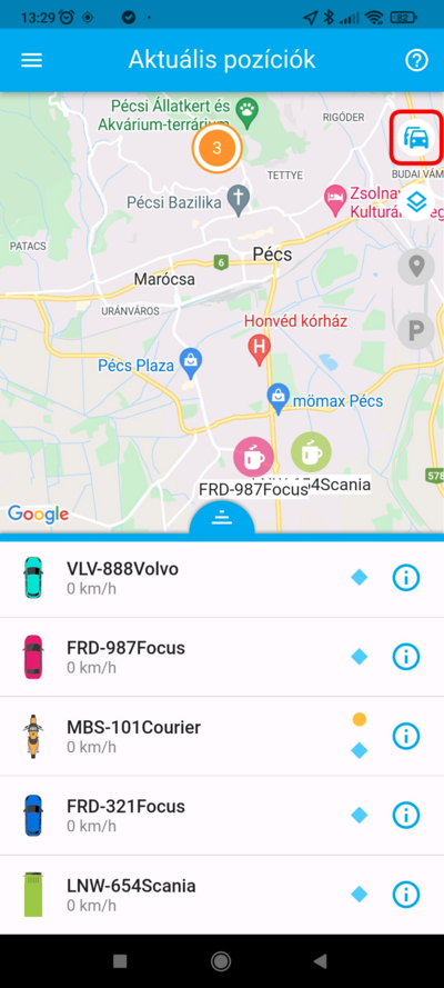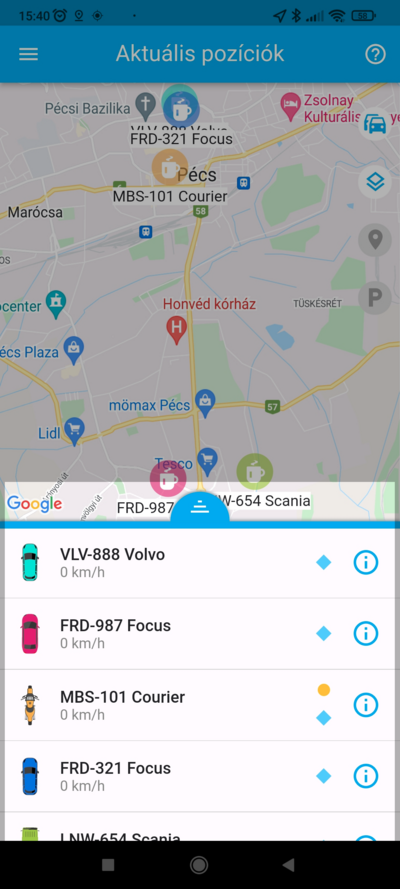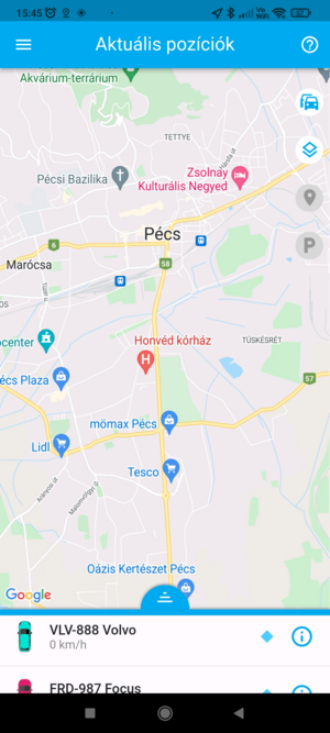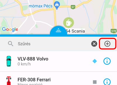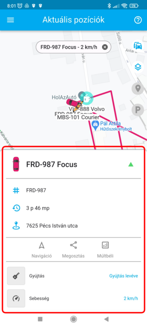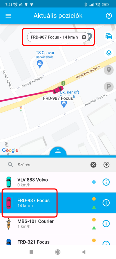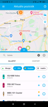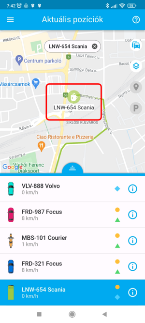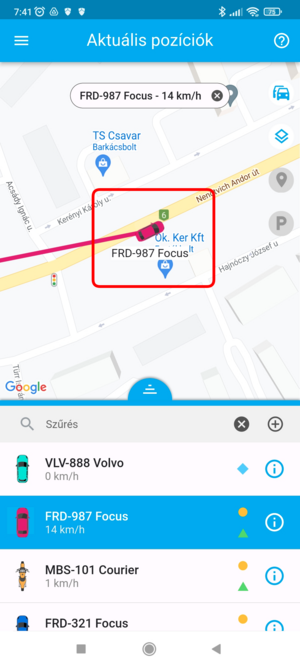Ha egy adott eszköz pozíciójára vagy kíváncsi, a listában koppints rá, ekkor a térkép az eszközt fókuszba helyezi, és ráközelít. Ezzel egyidőben az eszköz fölött megjelenik a nevet tartalmazó címke, amely mozgás esetén a pillanatnyi sebességet is tartalmazza. Ilyenkor a térkép követő módba kapcsol, a kiválasztott eszközt mozgás közben fókuszban tartja.