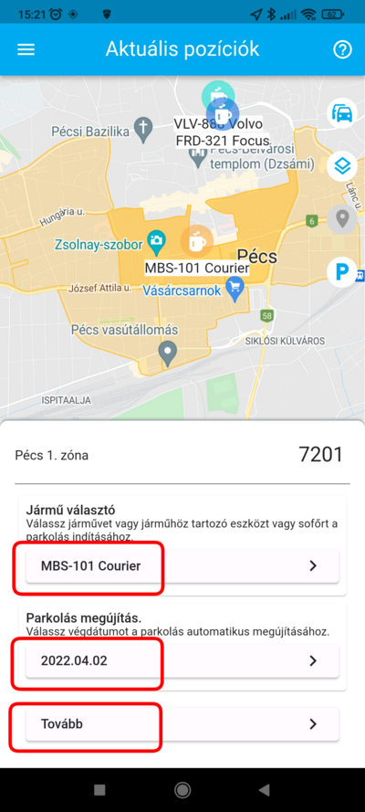 Ha a parkolás indításához szükséges adatokat kitöltötted, koppints a Tovább gombra.