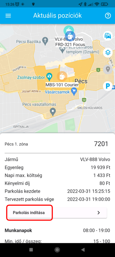 Amennyiben a parkolózónában, vagy annak közelében tartózkodó jármű adatlapjáról indítod a parkolást, a folyamat annyiban különbözik a fent leírtaktól, hogy nem kell kiválasztanod a járművet, ezt az információt ebben az esetben a rendszer automatikusan kitölti.