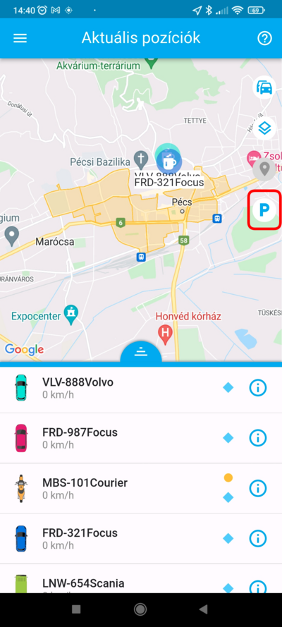 - a parkolózónában, vagy annak közelében álló jármű adatlapján, a P betűre bökve.