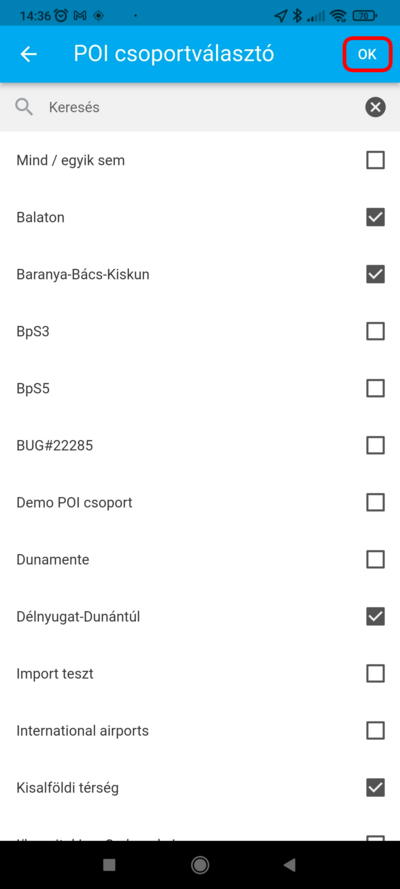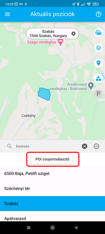 ekkor az alkalmazás visszatölti a POI listát, amelyben ekkor már csak a kiválasztott csoportokba tartozó POI-k szerepelnek.