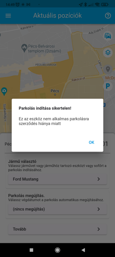 Parkolási szerződés hiányában az előkészítő ablakból nem tudsz parkolást indítani - erről üzenetben tájékoztatunk is - ehhez a webes felületen kell megkötni a parkolási szerződést.