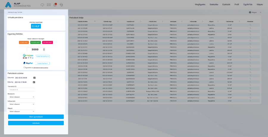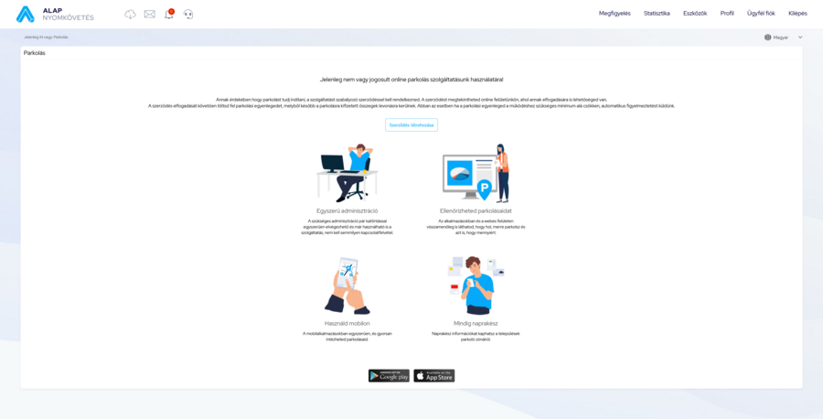 Online parkolást az Alapnyomkövetés rendszerben kizárólag a mobil alkalmazásokban indíthatnak ügyfeleink, a webes felület az adminisztratív előfeltételek teljesítésére, a szerződéskötésre, valamint az egyenleg feltöltésére szolgál.