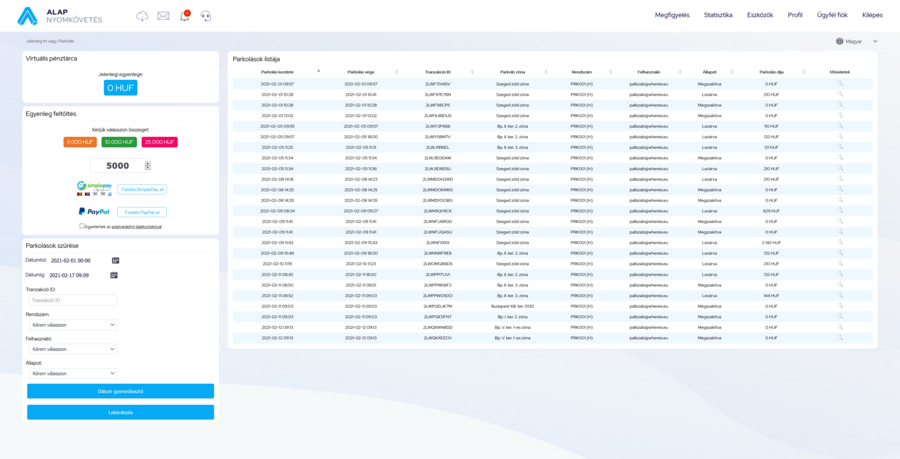 A Parkolás menü az online parkolás funkció adminisztratív kezelőfelülete, valamint a HolAzAutó mobil kliensben, a webes szolgáltatásunkhoz tartozó mobil applikációban indított parkolások listázására, és ellenőrzésére is szolgál.