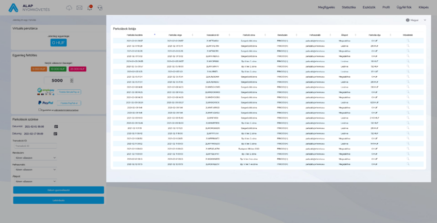 Ebben a panelben, a keresési paraméterek beállításával könnyen és gyorsan szűrhető a parkolási lista tartalma. Ügyfeleink a következő paraméterek mentén kereshetnek a parkolások között: