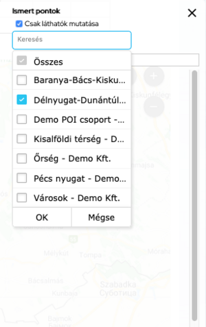 Ha a POI csoport választó felett aktiváljuk a Csak láthatók mutatása opciót, akkor a listában csak azon POI-k neve jelenik meg, amelyek a térképen a nagyítási szintnek megfelelően láthatók.